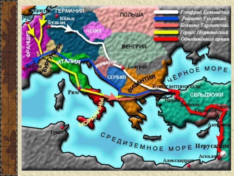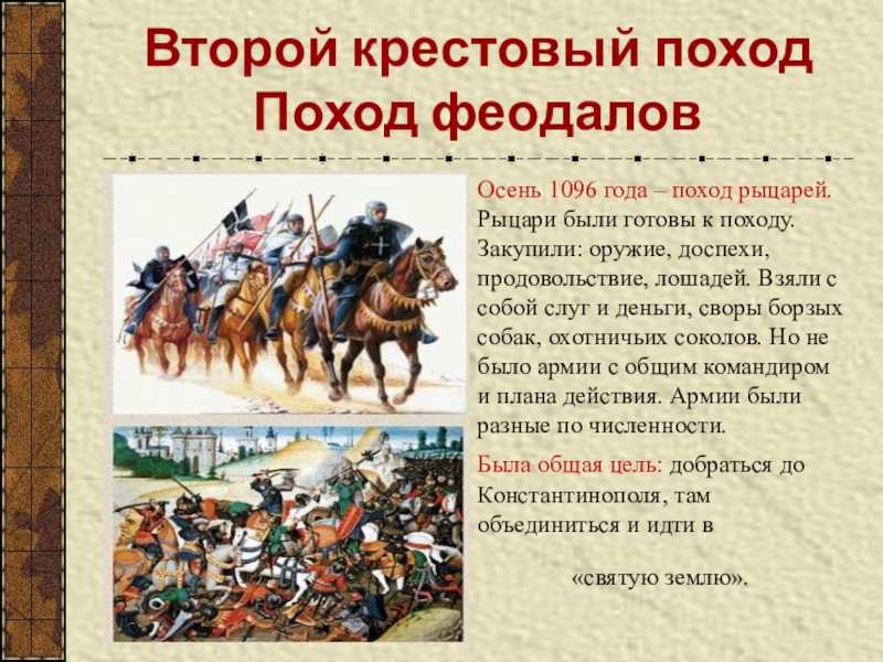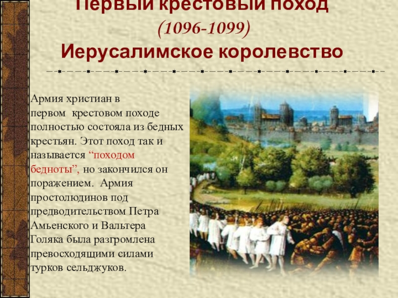 состояла из бедных крестьян. Этот поход так и называется “походом бедноты”, но закончился он поражением. Армия простолюдинов под предводительством Петра Амьенского и Вальтера Голяка была разгромлена превосходящими силами турков сельджуков.