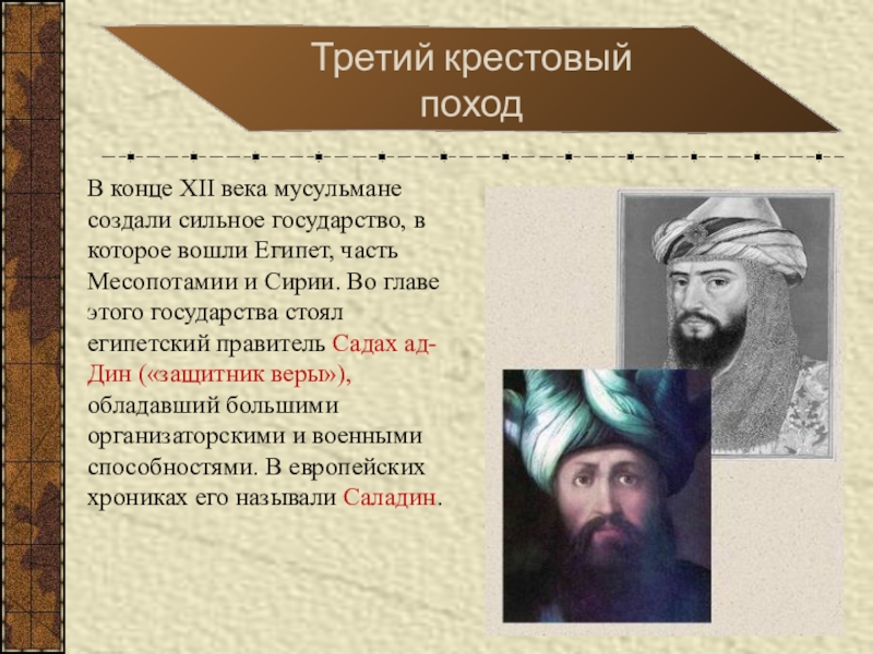 Египет, часть Месопотамии и Сирии. Во главе этого государства стоял египетский правитель Садах ад-Дин («защитник веры»), обладавший большими организаторскими и военными способностями. В европейских хрониках его называли Саладин.