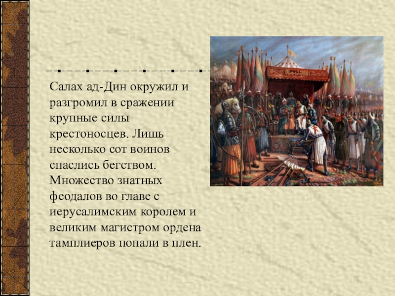 Слайд 21Салах ад-Дин окружил и разгромил в сражении крупные силы крестоносцев. Лишь