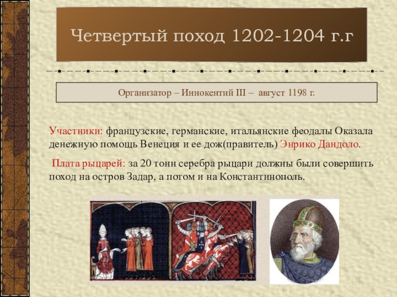 Плата рыцарей: за 20 тонн серебра рыцари должны были совершить поход на остров Задар, а потом и на Константинополь.