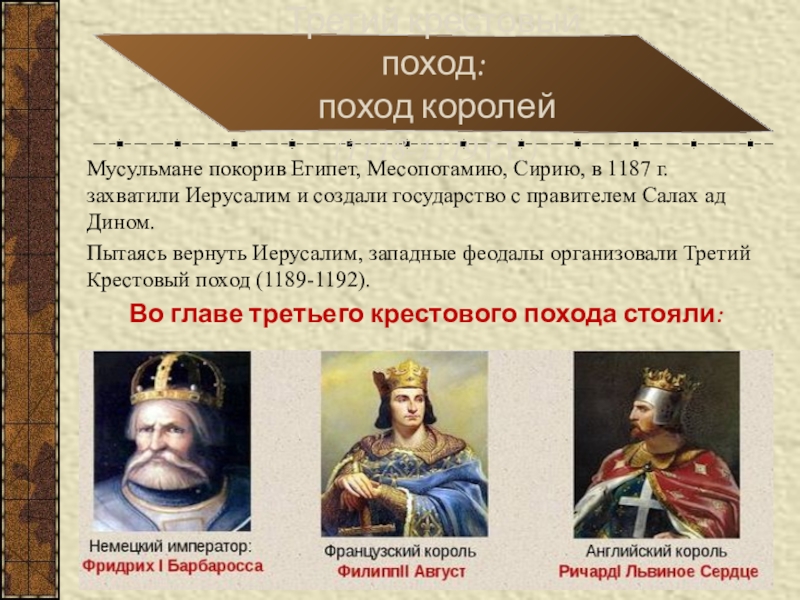 Пытаясь вернуть Иерусалим, западные феодалы организовали Третий Крестовый поход (1189-1192).