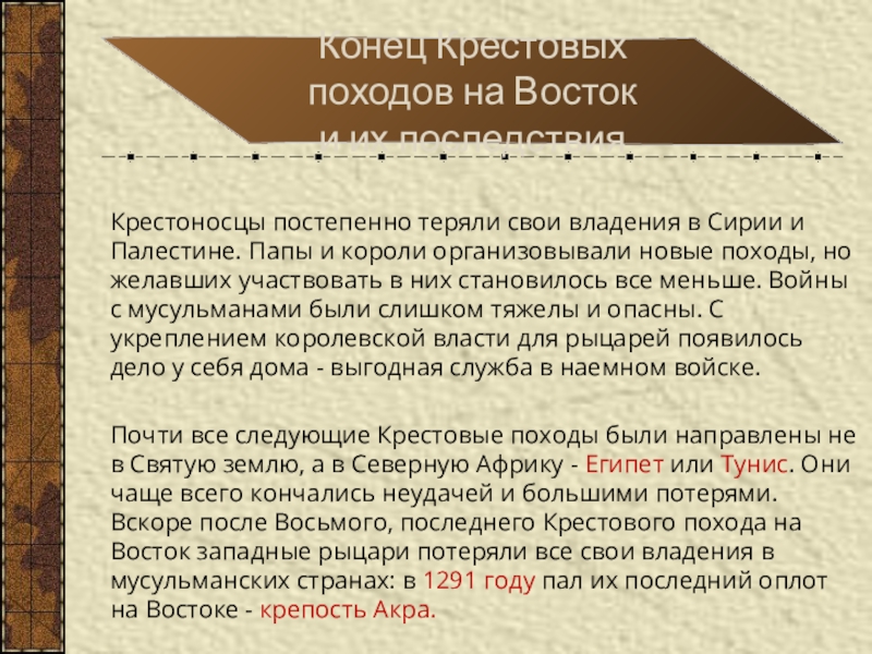 Почти все следующие Крестовые походы были направлены не в Святую землю, а в Северную Африку - Египет или Тунис. Они чаще всего кончались неудачей и большими потерями. Вскоре после Восьмого, последнего Крестового похода на Восток западные рыцари потеряли все свои владения в мусульманских странах: в 1291 году пал их последний оплот на Востоке - крепость Акра.