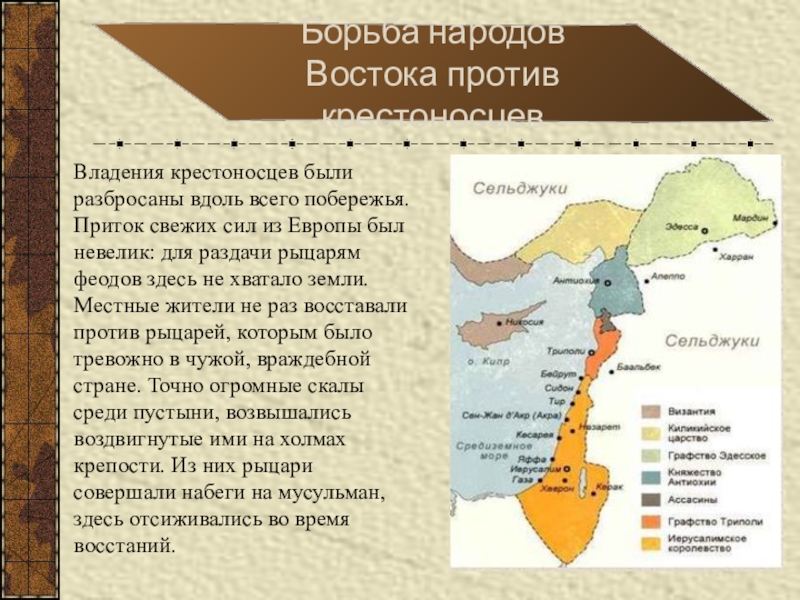 Слайд 18Владения крестоносцев были разбросаны вдоль всего побережья. Приток свежих сил из