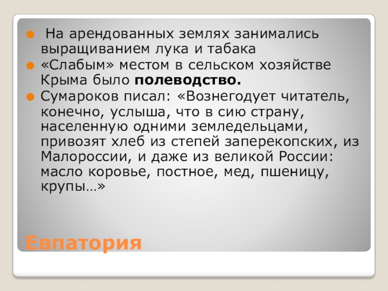 Сумароков писал: «Вознегодует читатель, конечно, услыша, что в сию страну, населенную одними земледельцами, привозят хлеб из степей заперекопских, из Малороссии, и даже из великой России: масло коровье, постное, мед, пшеницу, крупы…»
