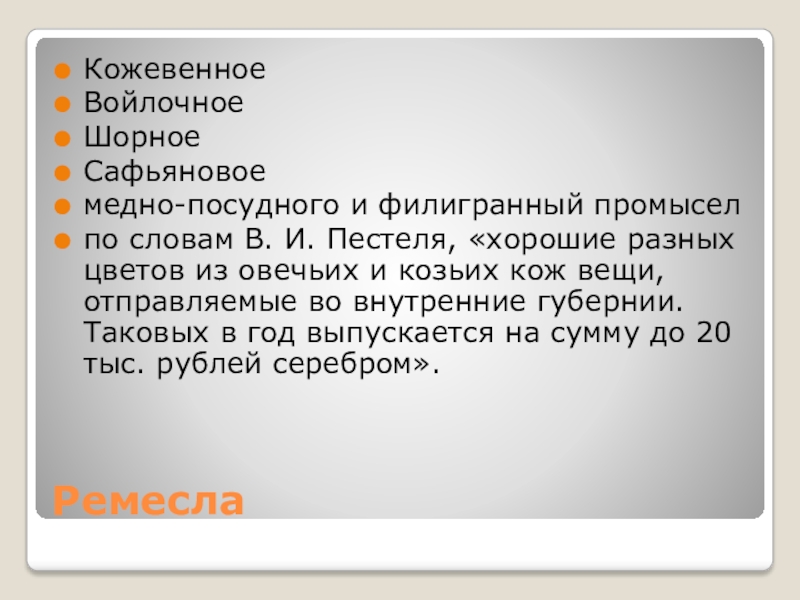 из овечьих и козьих кож вещи, отправляемые во внутренние губернии. Таковых в год выпускается на сумму до 20 тыс. рублей серебром».