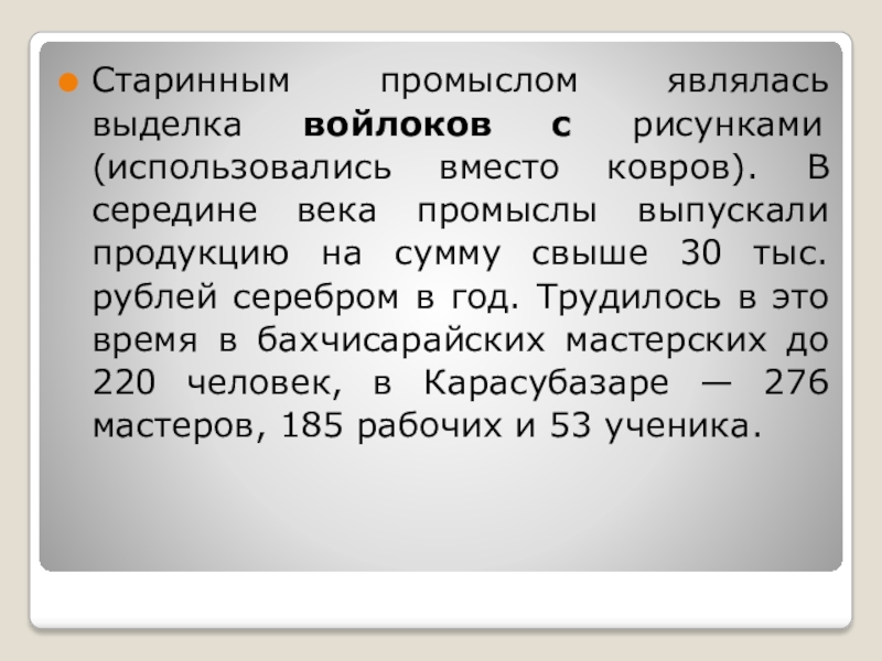 Слайд 19Старинным промыслом являлась выделка войлоков с рисунками (использовались вместо ковров). В