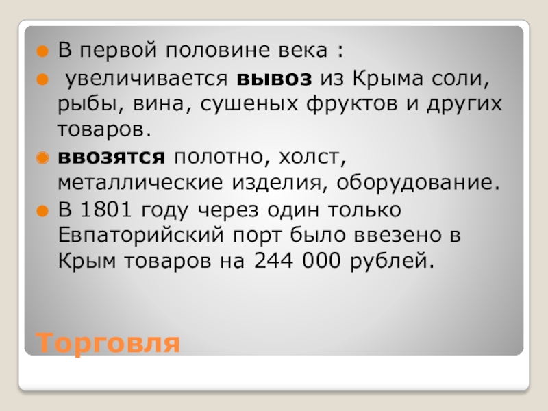 В 1801 году через один только Евпаторийский порт было ввезено в Крым товаров на 244 000 рублей.