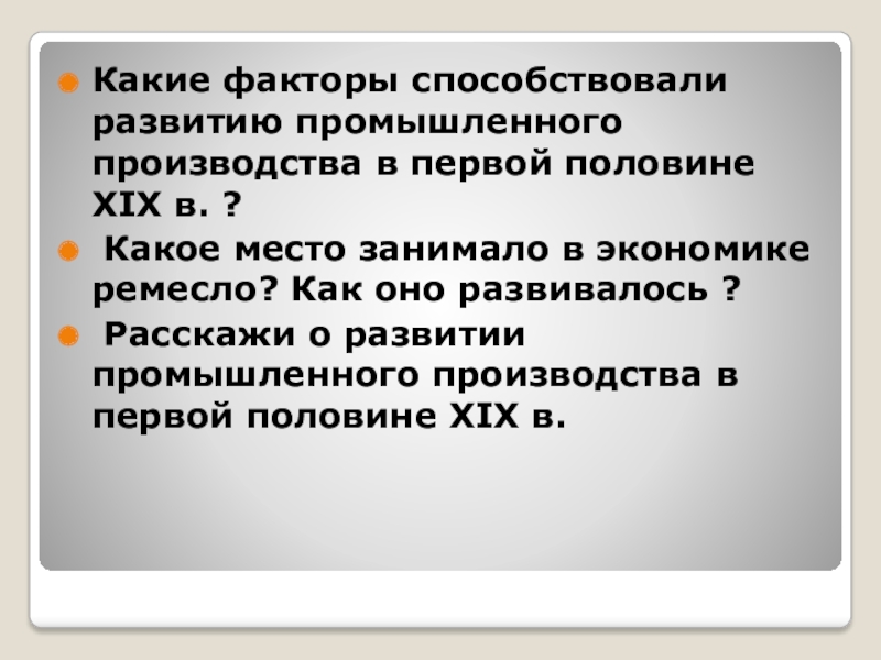 Слайд 21Какие факторы способствовали развитию промышленного производства в первой половине XIX в.