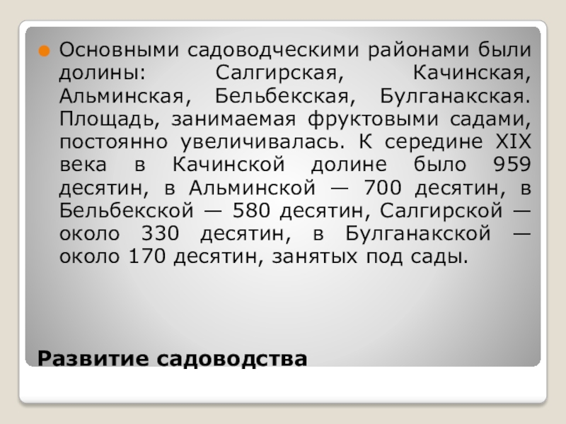 Основными садоводческими районами были долины: Салгирская, Качинская, Альминская, Бельбекская, Булганакская.