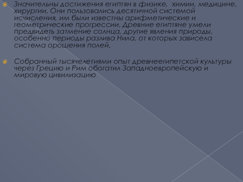 Слайд 12Значительны достижения египтян в физике, химии, медицине, хирургии. Они пользовались десятичной