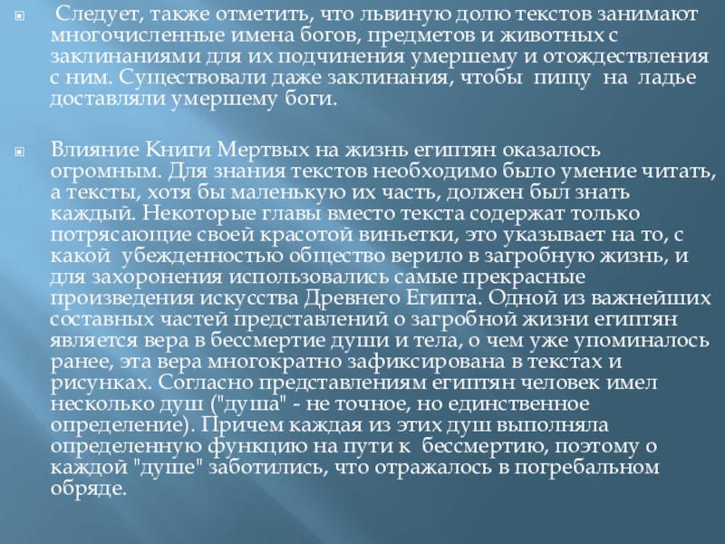 Влияние Книги Мертвых на жизнь египтян оказалось огромным. Для знания текстов необходимо было умение читать, а тексты, хотя бы маленькую их часть, должен был знать каждый. Некоторые главы вместо текста содержат только потрясающие своей красотой виньетки, это указывает на то, с какой убежденностью общество верило в загробную жизнь, и для захоронения использовались самые прекрасные произведения искусства Древнего Египта. Одной из важнейших составных частей представлений о загробной жизни египтян является вера в бессмертие души и тела, о чем уже упоминалось ранее, эта вера многократно зафиксирована в текстах и рисунках. Согласно представлениям египтян человек имел несколько душ ("душа" - не точное, но единственное определение). Причем каждая из этих душ выполняла определенную функцию на пути к бессмертию, поэтому о каждой "душе" заботились, что отражалось в погребальном обряде.