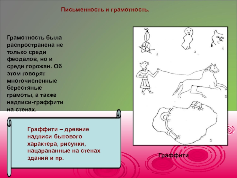 Граффити – древние надписи бытового характера, рисунки, нацарапанные на стенах зданий и пр.