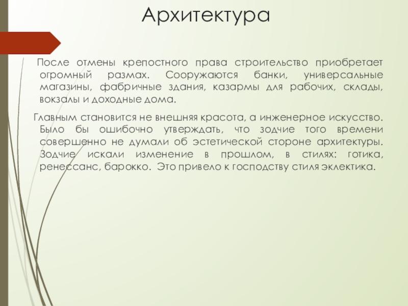 Главным становится не внешняя красота, а инженерное искусство. Было бы ошибочно утверждать, что зодчие того времени совершенно не думали об эстетической стороне архитектуры. Зодчие искали изменение в прошлом, в стилях: готика, ренессанс, барокко. Это привело к господству стиля эклектика.