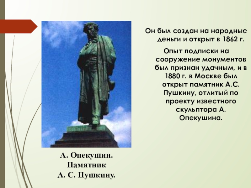 подписки на сооружение монументов был признан удачным, и в 1880 г. в Москве был открыт памятник А.С. Пушкину, отлитый по проекту известного скульптора А. Опекушина.