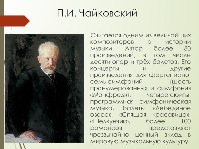 Автор более 80 произведений, в том числе десяти опер и трёх балетов. Его концерты и другие произведения для фортепиано, семь симфоний (шесть пронумерованных и симфония «Манфред»), четыре сюиты, программная симфоническая музыка, балеты «Лебединое озеро», «Спящая красавица», «Щелкунчик», более 100 романсов представляют чрезвычайно ценный вклад в мировую музыкальную культуру.