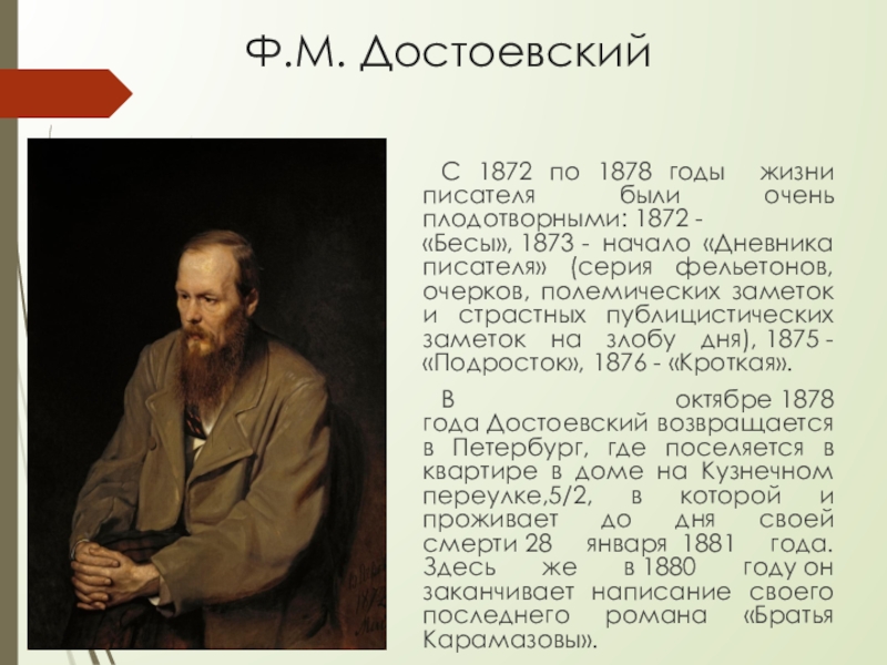 «Бесы», 1873 - начало «Дневника писателя» (серия фельетонов, очерков, полемических заметок и страстных публицистических заметок на злобу дня), 1875 - «Подросток», 1876 - «Кроткая».