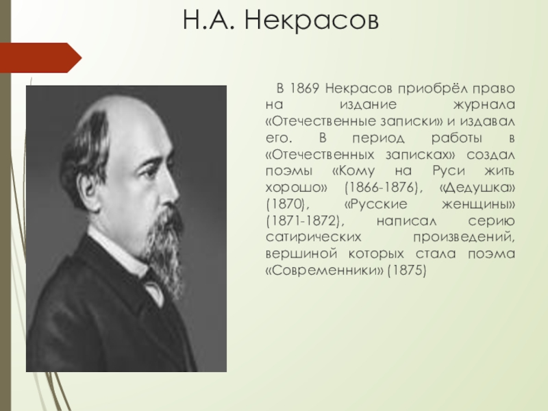 и издавал его. В период работы в «Отечественных записках» создал поэмы «Кому на Руси жить хорошо» (1866-1876), «Дедушка» (1870), «Русские женщины» (1871-1872), написал серию сатирических произведений, вершиной которых стала поэма «Современники» (1875)