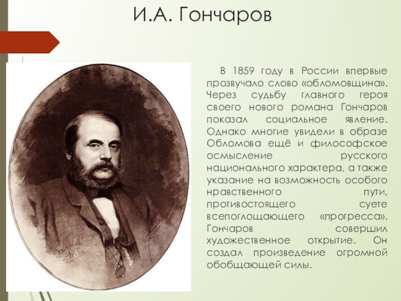 «обломовщина». Через судьбу главного героя своего нового романа Гончаров показал социальное явление. Однако многие увидели в образе Обломова ещё и философское осмысление русского национального характера, а также указание на возможность особого нравственного пути, противостоящего суете всепоглощающего «прогресса». Гончаров совершил художественное открытие. Он создал произведение огромной обобщающей силы.