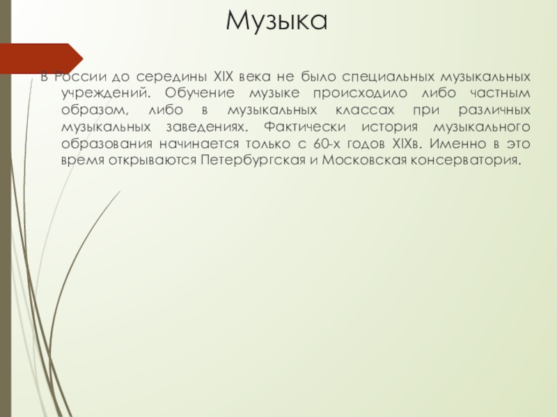 Обучение музыке происходило либо частным образом, либо в музыкальных классах при различных музыкальных заведениях. Фактически история музыкального образования начинается только с 60-х годов XIXв. Именно в это время открываются Петербургская и Московская консерватория.
