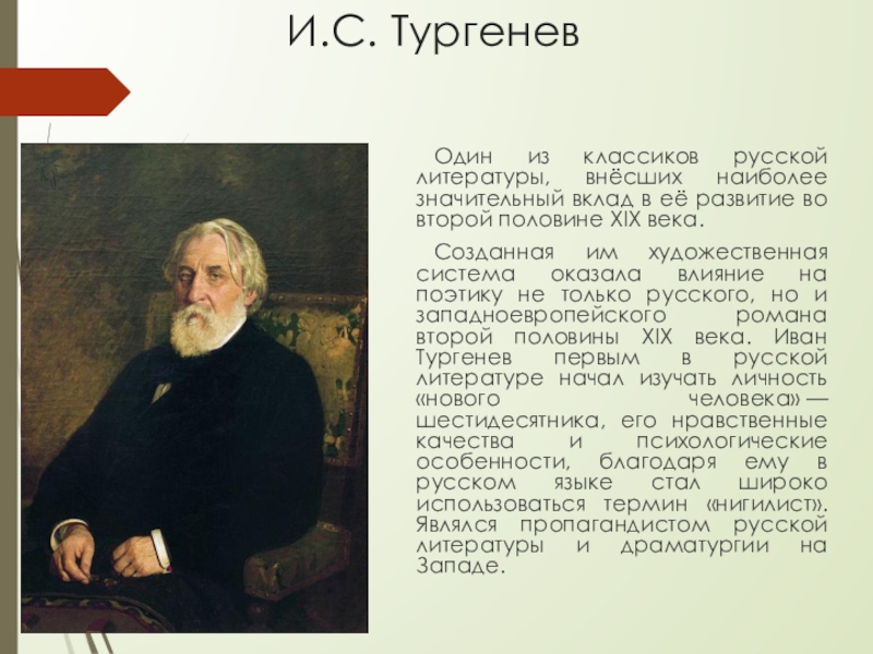 Созданная им художественная система оказала влияние на поэтику не только русского, но и западноевропейского романа второй половины XIX века. Иван Тургенев первым в русской литературе начал изучать личность «нового человека» — шестидесятника, его нравственные качества и психологические особенности, благодаря ему в русском языке стал широко использоваться термин «нигилист». Являлся пропагандистом русской литературы и драматургии на Западе.