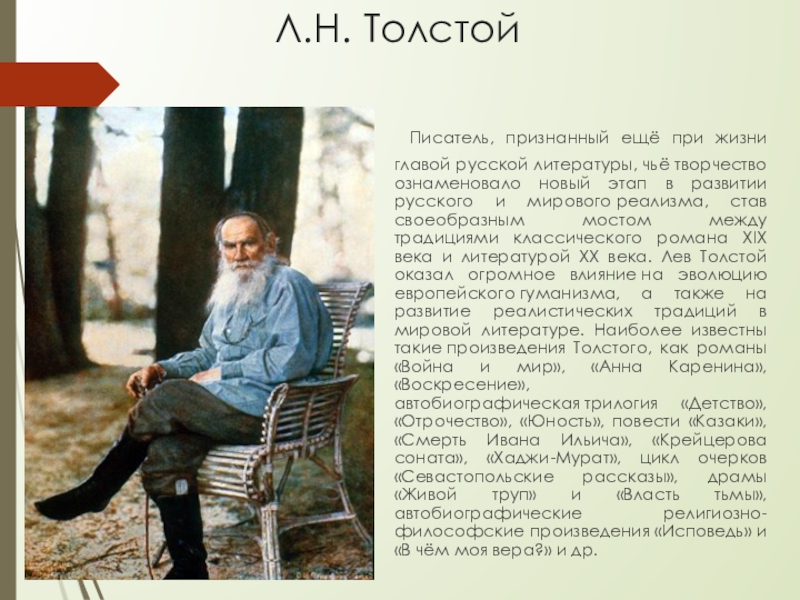 ознаменовало новый этап в развитии русского и мирового реализма, став своеобразным мостом между традициями классического романа XIX века и литературой XX века. Лев Толстой оказал огромное влияние на эволюцию европейского гуманизма, а также на развитие реалистических традиций в мировой литературе. Наиболее известны такие произведения Толстого, как романы «Война и мир», «Анна Каренина», «Воскресение», автобиографическая трилогия «Детство», «Отрочество», «Юность», повести «Казаки», «Смерть Ивана Ильича», «Крейцерова соната», «Хаджи-Мурат», цикл очерков «Севастопольские рассказы», драмы «Живой труп» и «Власть тьмы», автобиографические религиозно-философские произведения «Исповедь» и «В чём моя вера?» и др.
