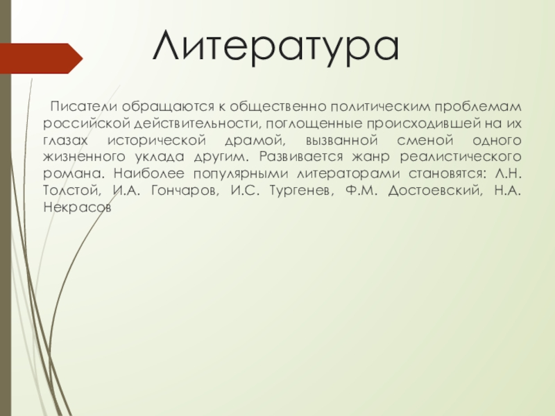 их глазах исторической драмой, вызванной сменой одного жизненного уклада другим. Развивается жанр реалистического романа. Наиболее популярными литераторами становятся: Л.Н. Толстой, И.А. Гончаров, И.С. Тургенев, Ф.М. Достоевский, Н.А. Некрасов