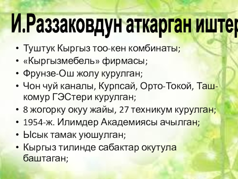 Слайд 7И.Раззаковдун аткарган иштери