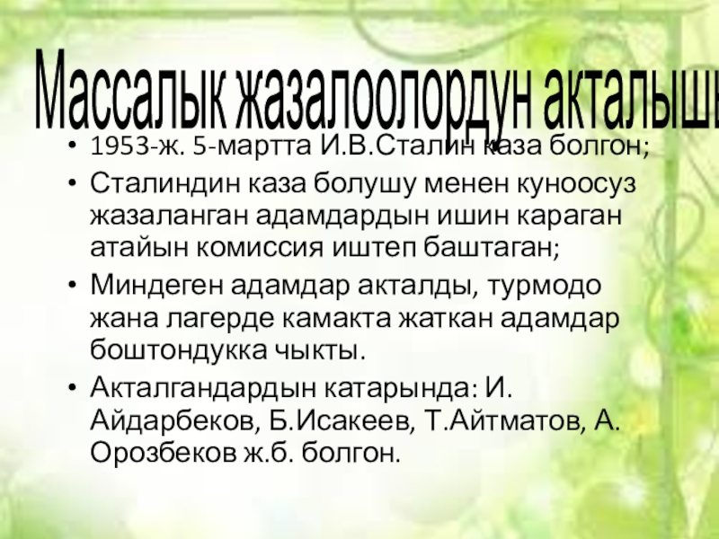 Массалык жазалоолордун акталышы1953-ж. 5-мартта И.В.Сталин каза болгон;Сталиндин каза болушу менен куноосуз жазаланган адамдардын ишин караган атайын комиссия