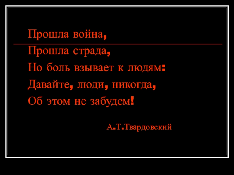 Прошла война, Прошла страда, Но боль взывает к людям: Давайте, люди, никогда, Об этом не забудем!