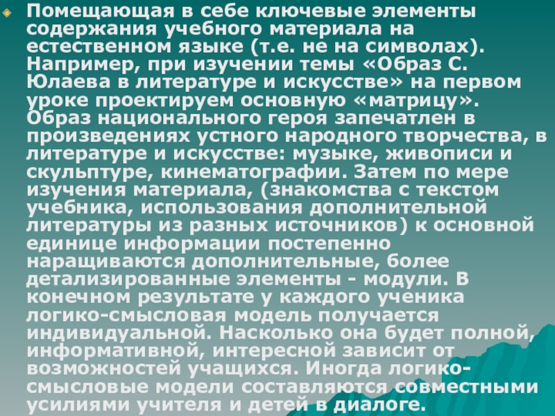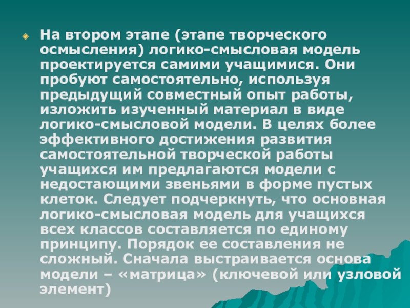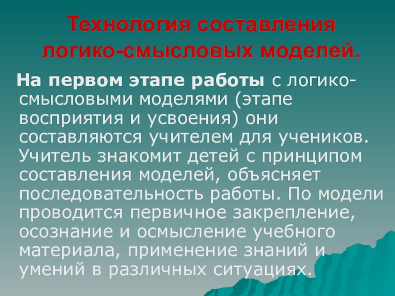 восприятия и усвоения) они составляются учителем для учеников. Учитель знакомит детей с принципом составления моделей, объясняет последовательность работы. По модели проводится первичное закрепление, осознание и осмысление учебного материала, применение знаний и умений в различных ситуациях.