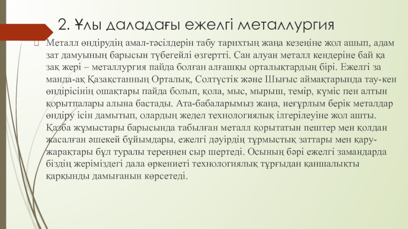 кезеңіне жол ашып, адамзат дамуының барысын түбегейлі өзгертті. Сан алуан металл кендеріне бай қазақ жері – металлургия пайда болған алғашқы орталықтардың бірі. Ежелгі заманда-ақ Қазақстанның Орталық, Солтүстік және Шығыс аймақтарында тау-кен өндірісінің ошақтары пайда болып, қола, мыс, мырыш, темір, күміс пен алтын қорытпалары алына бастады. Ата-бабаларымыз жаңа, неғұрлым берік металдар өндіру ісін дамытып, олардың жедел технологиялық ілгерілеуіне жол ашты. Қазба жұмыстары барысында табылған металл қорытатын пештер мен қолдан жасалған әшекей бұйымдары, ежелгі дәуірдің тұрмыстық заттары мен қару-жарақтары бұл туралы тереңнен сыр шертеді. Осының бәрі ежелгі замандарда біздің жеріміздегі дала өркениеті технологиялық тұрғыдан қаншалықты қарқынды дамығанын көрсетеді.