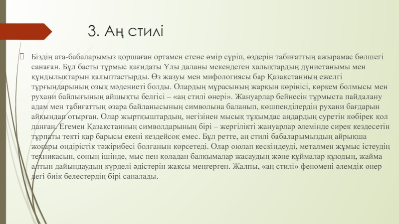 табиғаттың ажырамас бөлшегі санаған. Бұл басты тұрмыс қағидаты Ұлы даланы мекендеген халықтардың дүниетанымы мен құндылықтарын қалыптастырды. Өз жазуы мен мифологиясы бар Қазақстанның ежелгі тұрғындарының озық мәдениеті болды. Олардың мұрасының жарқын көрінісі, көркем болмысы мен рухани байлығының айшықты белгісі – «аң стилі өнері». Жануарлар бейнесін тұрмыста пайдалану адам мен табиғаттың өзара байланысының символына баланып, көшпенділердің рухани бағдарын айқындап отырған. Олар жыртқыштардың, негізінен мысық тұқымдас аңдардың суретін көбірек қолданған. Егемен Қазақстанның символдарының бірі – жергілікті жануарлар әлемінде сирек кездесетін тұрпаты текті қар барысы екені кездейсоқ емес. Бұл ретте, аң стилі бабаларымыздың айрықша жоғары өндірістік тәжірибесі болғанын көрсетеді. Олар оюлап кескіндеуді, металмен жұмыс істеудің техникасын, соның ішінде, мыс пен қоладан балқымалар жасаудың және құймалар құюдың, жайма алтын дайындаудың күрделі әдістерін жақсы меңгерген. Жалпы, «аң стилі» феномені әлемдік өнердегі биік белестердің бірі саналады.