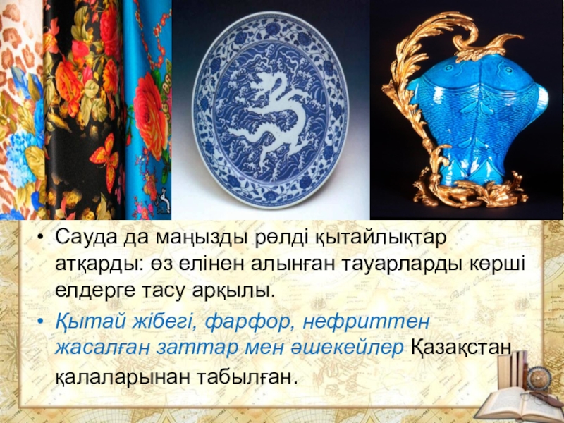 Қытай жібегі, фарфор, нефриттен жасалған заттар мен әшекейлер Қазақстан қалаларынан табылған.