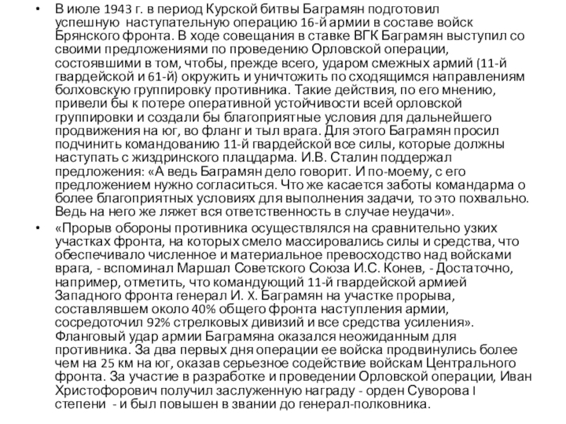 Слайд 20В июле 1943 г. в период Курской битвы Баграмян подготовил успешную
