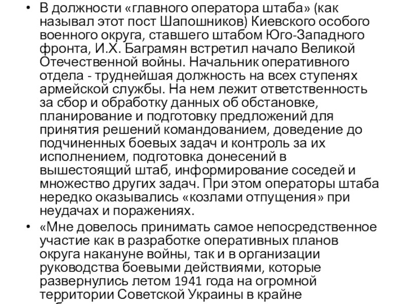 особого военного округа, ставшего штабом Юго-Западного фронта, И.Х. Баграмян встретил начало Великой Отечественной войны. Начальник оперативного отдела - труднейшая должность на всех ступенях армейской службы. На нем лежит ответственность за сбор и обработку данных об обстановке, планирование и подготовку предложений для принятия решений командованием, доведение до подчиненных боевых задач и контроль за их исполнением, подготовка донесений в вышестоящий штаб, информирование соседей и множество других задач. При этом операторы штаба нередко оказывались «козлами отпущения» при неудачах и поражениях.