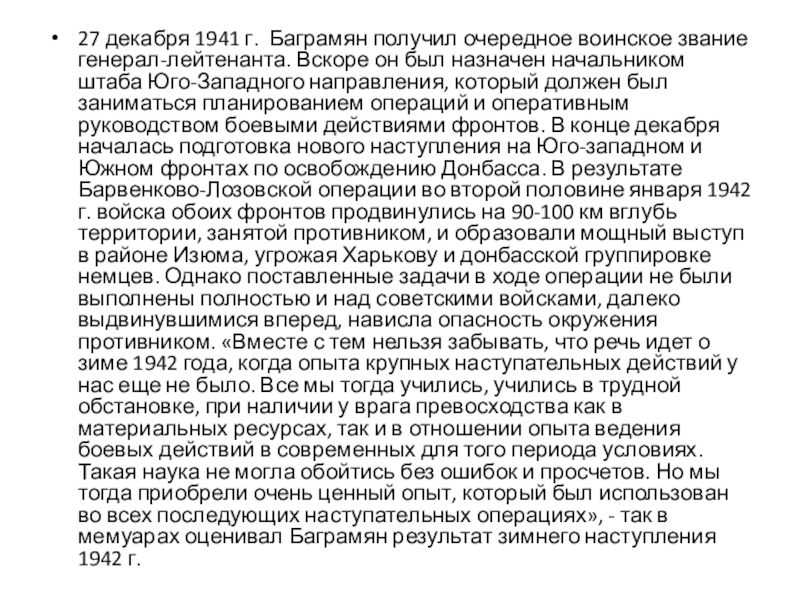 он был назначен начальником штаба Юго-Западного направления, который должен был заниматься планированием операций и оперативным руководством боевыми действиями фронтов. В конце декабря началась подготовка нового наступления на Юго-западном и Южном фронтах по освобождению Донбасса. В результате Барвенково-Лозовской операции во второй половине января 1942 г. войска обоих фронтов продвинулись на 90-100 км вглубь территории, занятой противником, и образовали мощный выступ в районе Изюма, угрожая Харькову и донбасской группировке немцев. Однако поставленные задачи в ходе операции не были выполнены полностью и над советскими войсками, далеко выдвинувшимися вперед, нависла опасность окружения противником. «Вместе с тем нельзя забывать, что речь идет о зиме 1942 года, когда опыта крупных наступательных действий у нас еще не было. Все мы тогда учились, учились в трудной обстановке, при наличии у врага превосходства как в материальных ресурсах, так и в отношении опыта ведения боевых действий в современных для того периода условиях. Такая наука не могла обойтись без ошибок и просчетов. Но мы тогда приобрели очень ценный опыт, который был использован во всех последующих наступательных операциях», - так в мемуарах оценивал Баграмян результат зимнего наступления 1942 г.