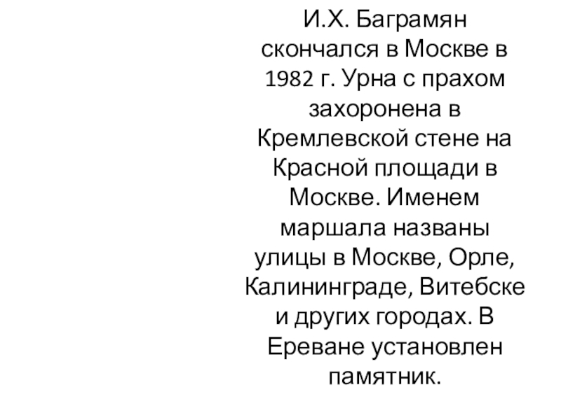 Слайд 28И.Х. Баграмян скончался в Москве в 1982 г. Урна с прахом