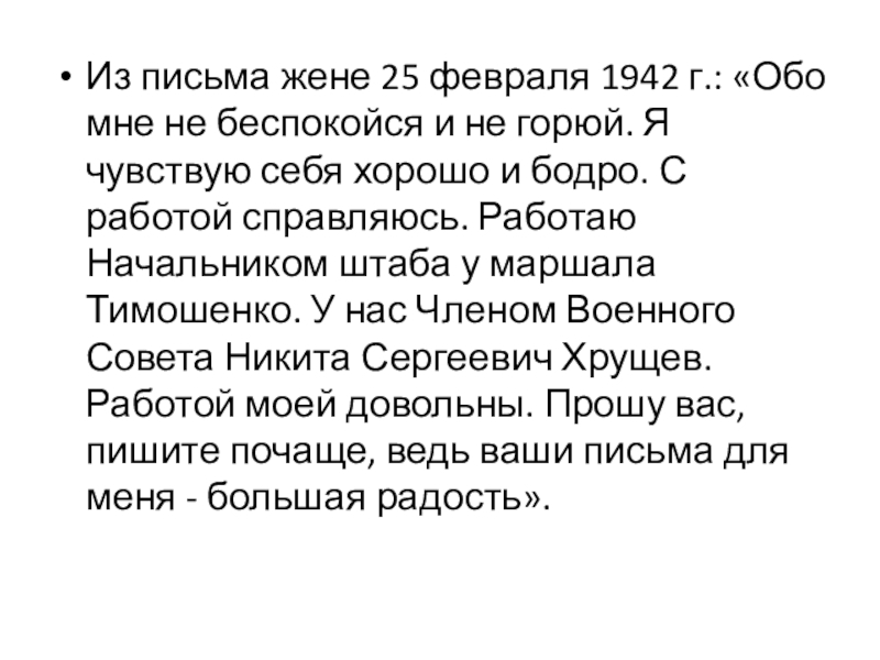 Слайд 15Из письма жене 25 февраля 1942 г.: «Обо мне не беспокойся