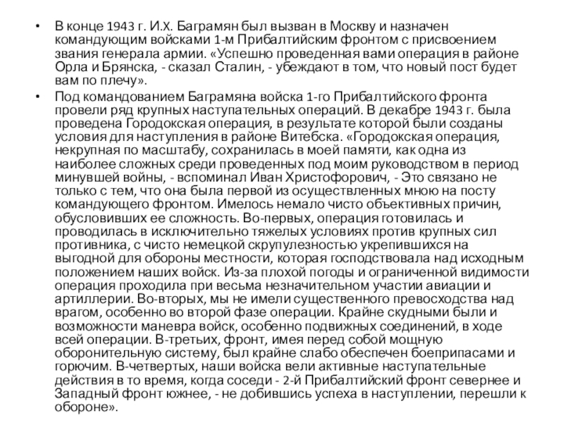 Под командованием Баграмяна войска 1-го Прибалтийского фронта провели ряд крупных наступательных операций. В декабре 1943 г. была проведена Городокская операция, в результате которой были созданы условия для наступления в районе Витебска. «Городокская операция, некрупная по масштабу, сохранилась в моей памяти, как одна из наиболее сложных среди проведенных под моим руководством в период минувшей войны, - вспоминал Иван Христофорович, - Это связано не только с тем, что она была первой из осуществленных мною на посту командующего фронтом. Имелось немало чисто объективных причин, обусловивших ее сложность. Во-первых, операция готовилась и проводилась в исключительно тяжелых условиях против крупных сил противника, с чисто немецкой скрупулезностью укрепившихся на выгодной для обороны местности, которая господствовала над исходным положением наших войск. Из-за плохой погоды и ограниченной видимости операция проходила при весьма незначительном участии авиации и артиллерии. Во-вторых, мы не имели существенного превосходства над врагом, особенно во второй фазе операции. Крайне скудными были и возможности маневра войск, особенно подвижных соединений, в ходе всей операции. В-третьих, фронт, имея перед собой мощную оборонительную систему, был крайне слабо обеспечен боеприпасами и горючим. В-четвертых, наши войска вели активные наступательные действия в то время, когда соседи - 2-й Прибалтийский фронт севернее и Западный фронт южнее, - не добившись успеха в наступлении, перешли к обороне».