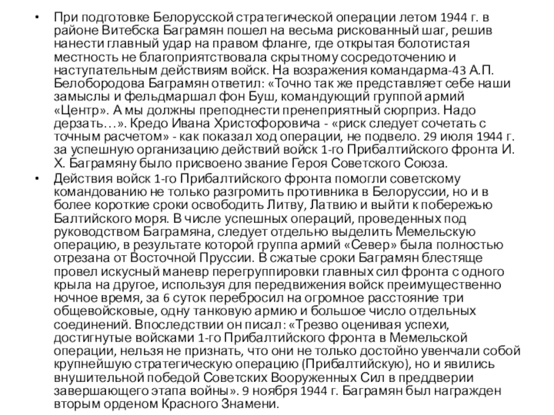 Баграмян пошел на весьма рискованный шаг, решив нанести главный удар на правом фланге, где открытая болотистая местность не благоприятствовала скрытному сосредоточению и наступательным действиям войск. На возражения командарма-43 А.П. Белобородова Баграмян ответил: «Точно так же представляет себе наши замыслы и фельдмаршал фон Буш, командующий группой армий «Центр». А мы должны преподнести пренеприятный сюрприз. Надо дерзать…». Кредо Ивана Христофоровича - «риск следует сочетать с точным расчетом» - как показал ход операции, не подвело. 29 июля 1944 г. за успешную организацию действий войск 1-го Прибалтийского фронта И.Х. Баграмяну было присвоено звание Героя Советского Союза.