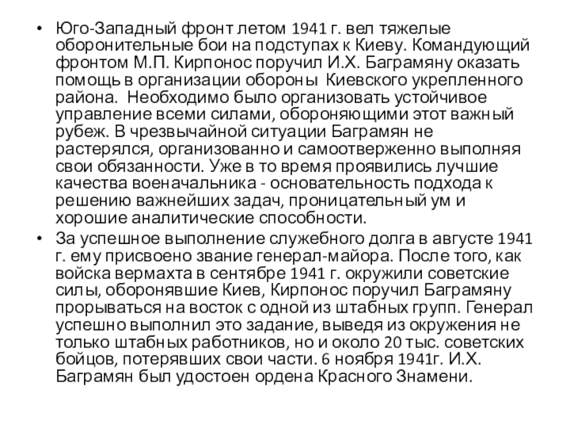 к Киеву. Командующий фронтом М.П. Кирпонос поручил И.Х. Баграмяну оказать помощь в организации обороны Киевского укрепленного района. Необходимо было организовать устойчивое управление всеми силами, обороняющими этот важный рубеж. В чрезвычайной ситуации Баграмян не растерялся, организованно и самоотверженно выполняя свои обязанности. Уже в то время проявились лучшие качества военачальника - основательность подхода к решению важнейших задач, проницательный ум и хорошие аналитические способности.