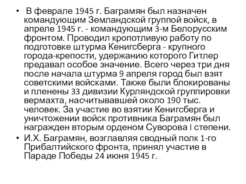 в апреле 1945 г. - командующим 3-м Белорусским фронтом. Проводил кропотливую работу по подготовке штурма Кенигсберга - крупного города-крепости, удержанию которого Гитлер предавал особое значение. Всего через три дня после начала штурма 9 апреля город был взят советскими войсками. Также были блокированы и пленены 33 дивизии Курляндской группировки вермахта, насчитывавшей около 190 тыс. человек. За участие во взятии Кенигсберга и уничтожении войск противника Баграмян был награжден вторым орденом Суворова I степени.