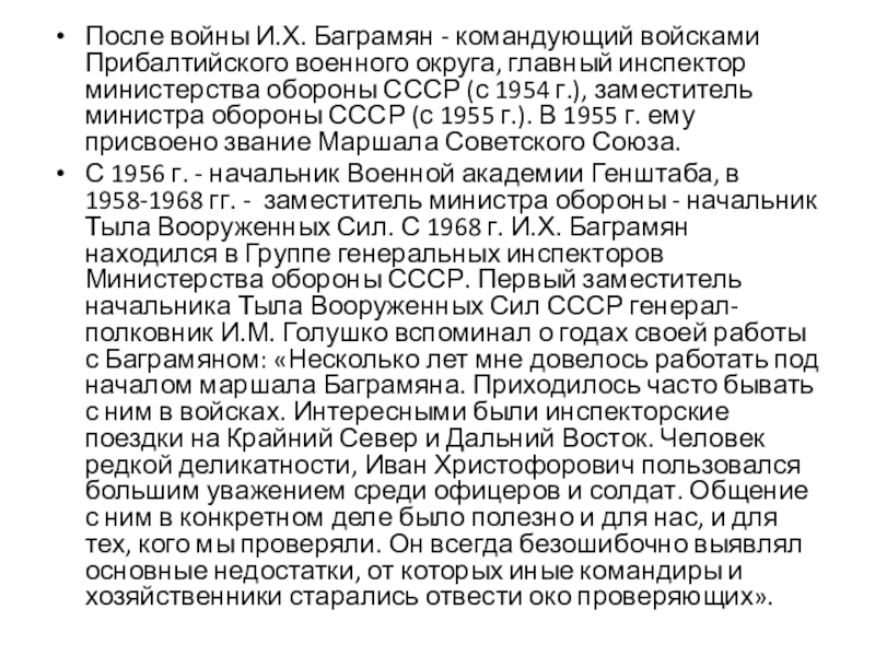 Слайд 27После войны И.Х. Баграмян - командующий войсками Прибалтийского военного округа, главный
