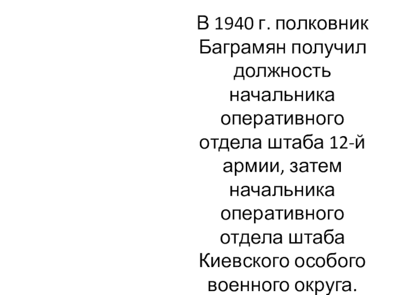 Слайд 7В 1940 г. полковник Баграмян получил должность начальника оперативного отдела штаба