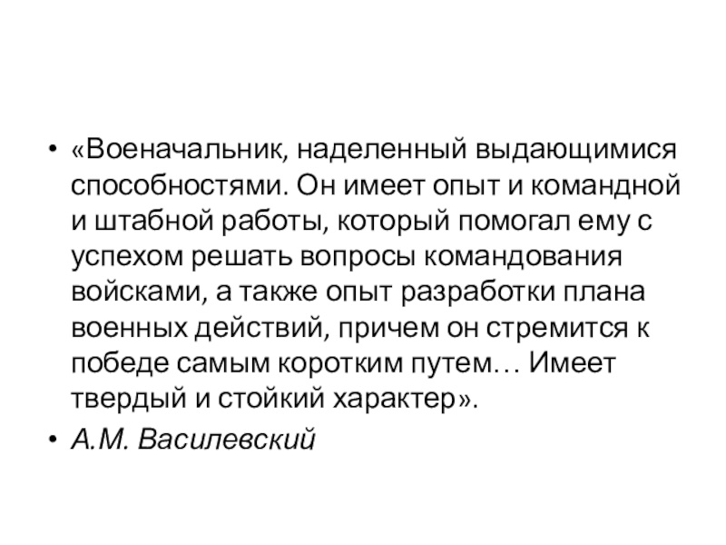 работы, который помогал ему с успехом решать вопросы командования войсками, а также опыт разработки плана военных действий, причем он стремится к победе самым коротким путем… Имеет твердый и стойкий характер».