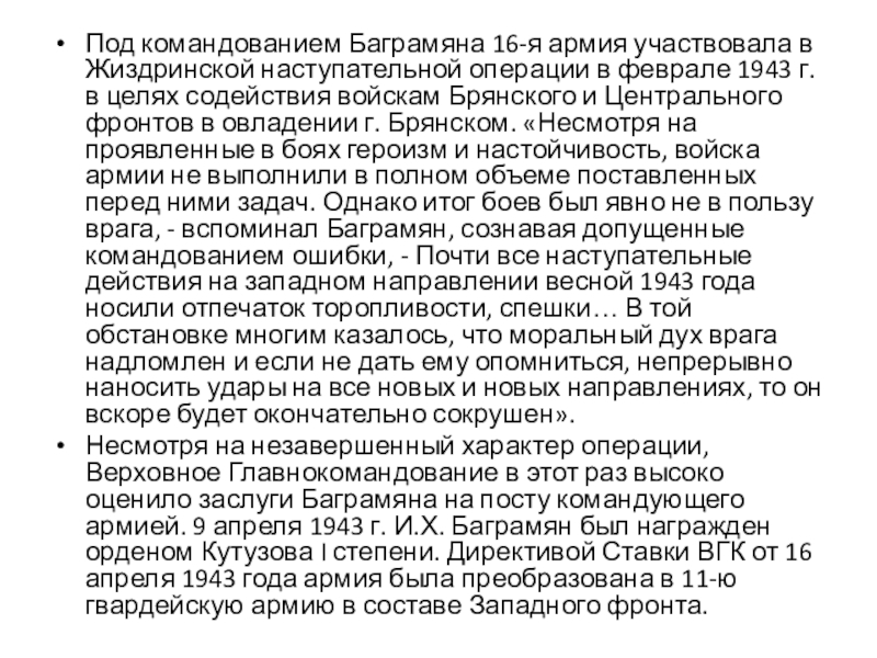 Слайд 18Под командованием Баграмяна 16-я армия участвовала в Жиздринской наступательной операции в