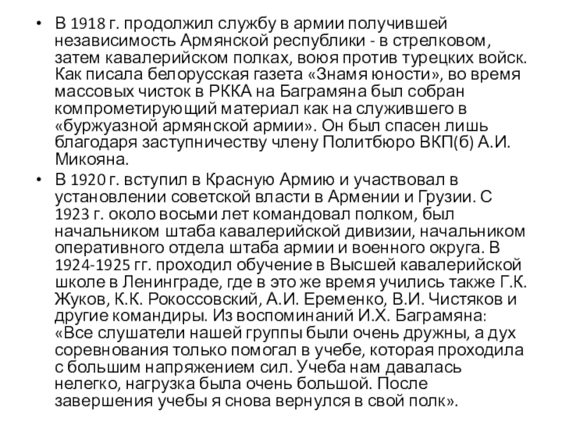 - в стрелковом, затем кавалерийском полках, воюя против турецких войск. Как писала белорусская газета «Знамя юности», во время массовых чисток в РККА на Баграмяна был собран компрометирующий материал как на служившего в «буржуазной армянской армии». Он был спасен лишь благодаря заступничеству члену Политбюро ВКП(б) А.И. Микояна.