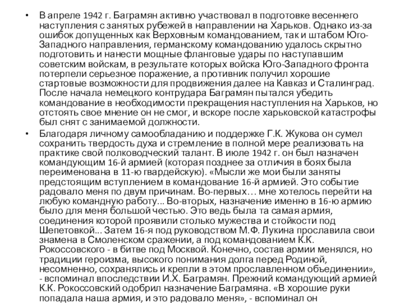 Слайд 17В апреле 1942 г. Баграмян активно участвовал в подготовке весеннего наступления