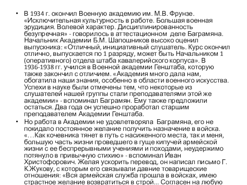Слайд 6В 1934 г. окончил Военную академию им. М.В. Фрунзе. «Исключительная культурность