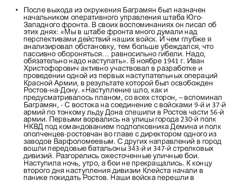 Юго-Западного фронта. В своих воспоминаниях он писал об этих днях: «Мы в штабе фронта много думали над перспективами действий наших войск. И чем глубже я анализировал обстановку, тем больше убеждался, что пассивно обороняться… равносильно гибели. Надо, обязательно надо наступать». В ноябре 1941 г. Иван Христофорович активно участвовал в разработке и проведении одной из первых наступательных операций Красной Армии, в результате которой был освобожден Ростов-на-Дону. «Наступление шло, как и предусматривалось планом, со всех сторон, – вспоминал Баграмян, - С востока на соединение с войсками 9-й и 37-й армий по тонкому льду Дона спешили в Ростов части 56-й армии. Первыми ворвались на улицы города 230-й полк НКВД под командованием подполковника Демина и полк ополченцев-ростовчан во главе с директором одного из заводов Варфоломеевым. С других направлений в город вошли передовые батальоны 343-й и 347-й стрелковых дивизий. Разгорелись ожесточенные уличные бои. Наступила ночь, утро, а бои не прекращались. К концу второго дня наступления дивизии Клейста начали в панике покидать Ростов. Наши войска перешли в стремительное преследование».